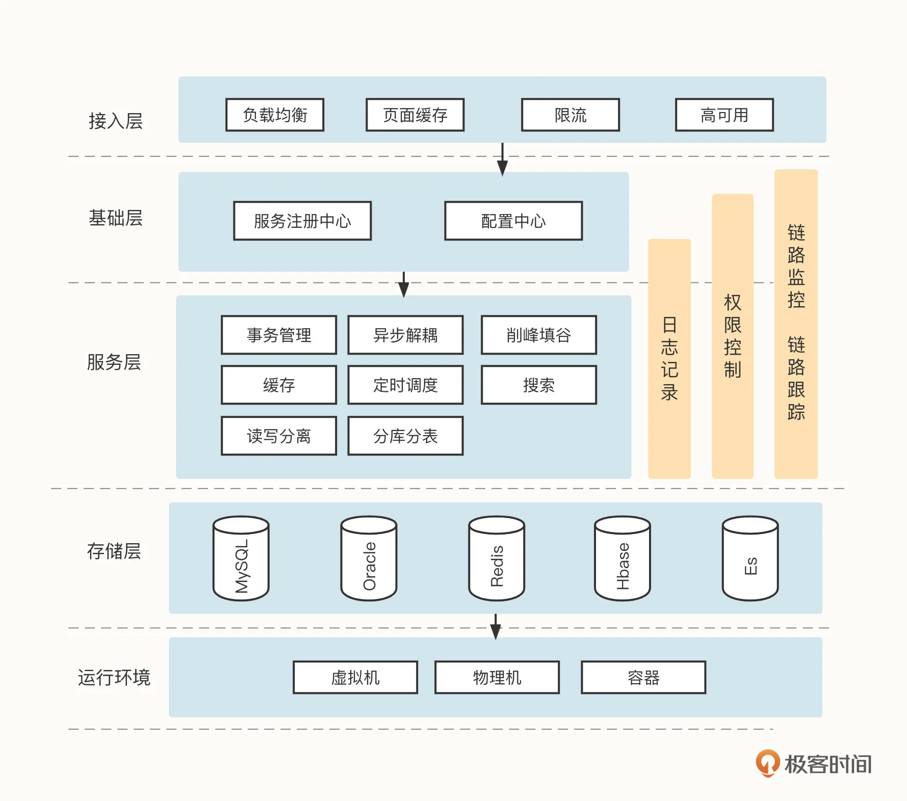 中间件的这种持续发展和系统的内部结构有关。可以结合你们公司的业务想一下,为了追求高并发、高性能、高可用性还有扩展性,是不是在对软件架构进行部署时,通常会采用分层架构思想,将系统架构分为接入层、基础层、服务层、数据存储层和运行环境,而每一层需要解决的问题各不相同。就像这样一个系统架构模型。