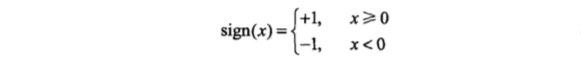 其中\(x\)代表输入的特征空间向量,输出空间是{-1, +1},\(w\)为权值向量,\(b\)叫作偏置,\(sign\)是一个符号函数。