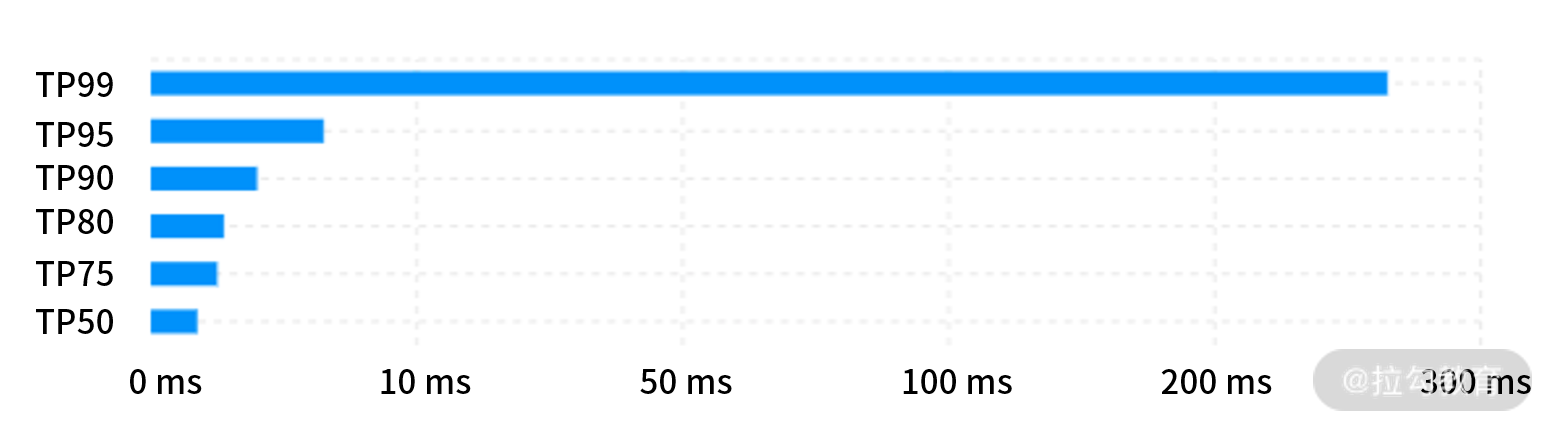 用文字不太好理解,我们来看下面这张图。这是一张比较典型的分位值图,我们可以看到图中有 6 个桶,分别是 50、75、80、90、95、99,而桶的值就是相对应的耗时情况。