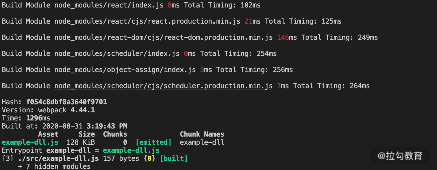 而在通过 DllPlugin 和 DllReferencePlugin 分别配置后的构建时间就变成如下图所示,由于构建时减少了最耗时的模块,构建效率瞬间提升十倍。