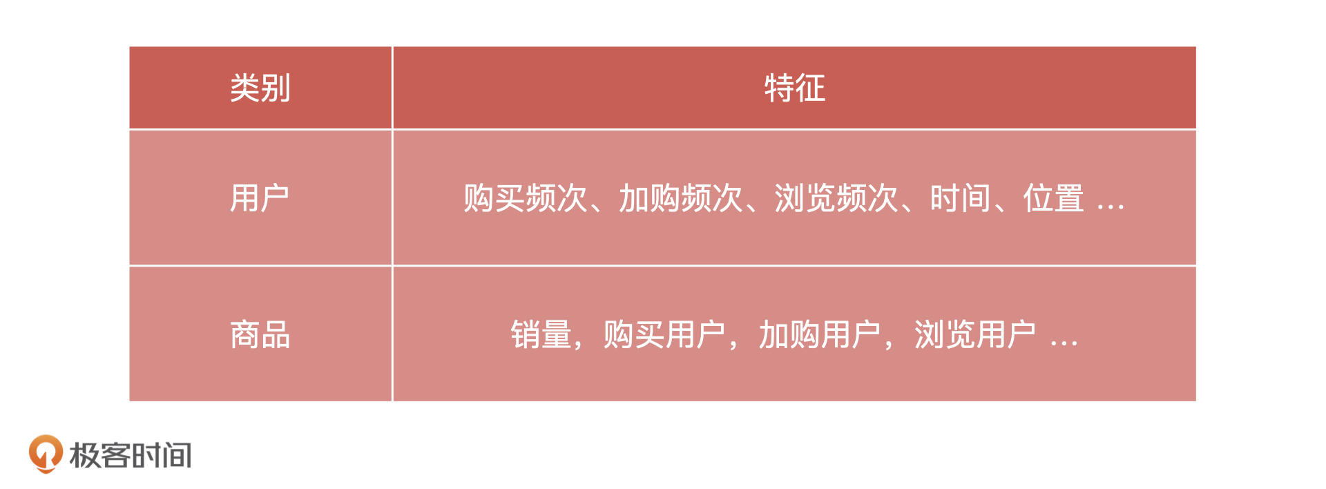 这其实就是模型设计,我们在第6课讲过,模型设计最重要的工作是定义模型的目标变量和抽取数据样本。那针对刚才这个场景,模型的目标变量就是用户点击了苹果手机商品页面,数据样本就是历史产生过点击行为的用户浏览日志。这里,我们会用到的特征包括用户在京东的浏览,购买的历史信息。