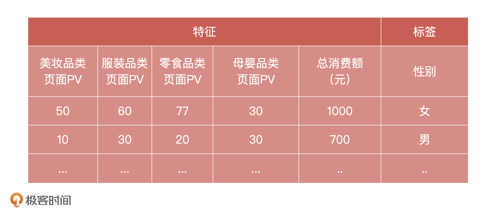 那逻辑回归是怎么解决分类问题的呢?因为逻辑回归属于有监督学习的分类算法,所以在使用它之前,我们必须要先收集一批已标注好的数据作为训练集,比如说用户的基本信息、浏览日志,购买日志等等。