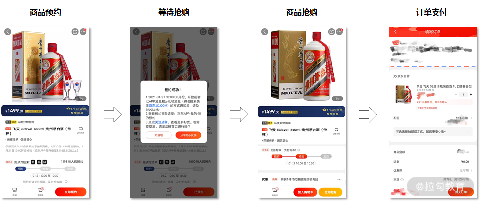 在大促活动期间,“预约抢购”已经是各大电商平台的主要促销手段,京东自然也会和一些大的供应商合作,推出一些低价的爆款产品,比如 2019 年的 “1499 元抢购飞天茅台”活动,就让很多人每天准时准点拿着手机拼人品。