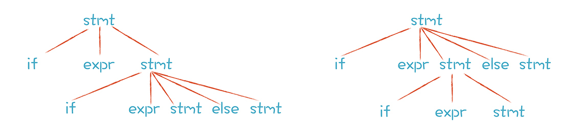 | other按照这个语法规则,先采用第一条产生式推导或先采用第二条产生式推导,会得到不同的AST。左边的这棵AST中,else跟第二个if配对;右边的这棵AST中,else跟第一个if配对。