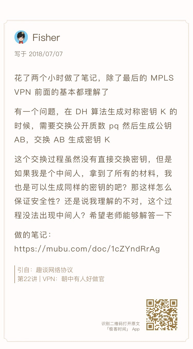 这位同学的笔记特别认真,让人感动。DH算法的交换材料要分公钥部分和私钥部分,公钥部分和其他非对称加密一样,都是可以传输的,所以对于安全性是没有影响的,而且传输材料远比传输原始的公钥更加安全。私钥部分是谁都不能给的,因此也是不会截获到的。