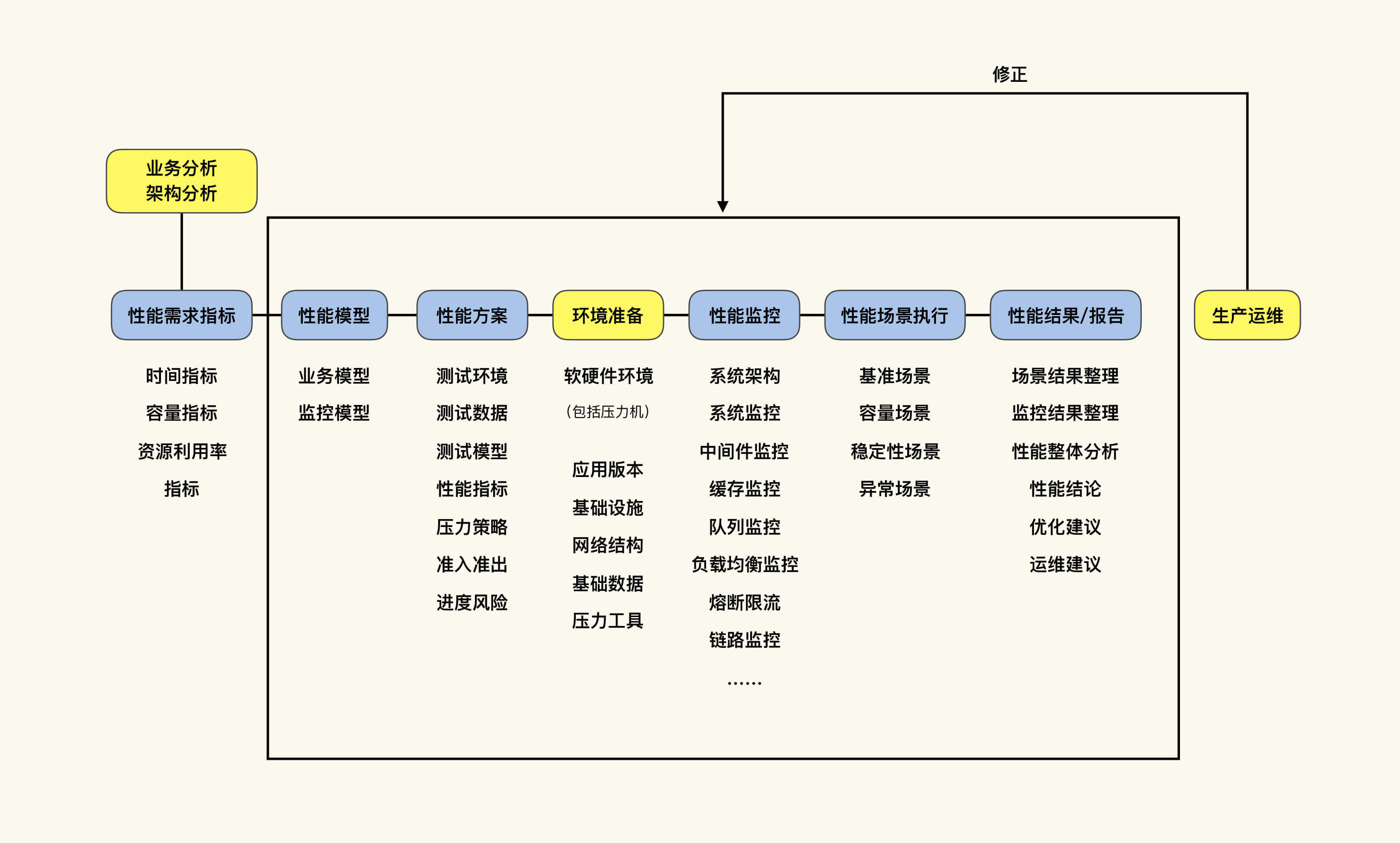 在系统上线运维之后,我们还需要把运维过程中产生的业务数据和性能监控数据,与前面做的性能场景结果数据做环比。如果比出了问题,那就修正性能过程,然后再从修正点接着往下做。