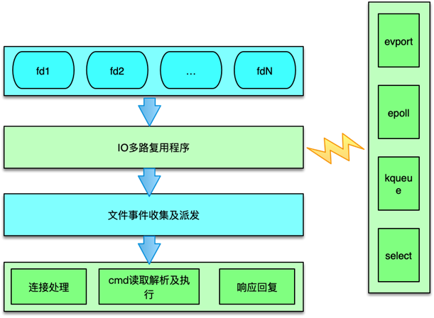如果当前编译环境没有上述函数,就会选择 select 作为底层实现方案。select 方案的性能较差,事件发生时,会扫描全部监听的描述符,事件复杂度是 O(n),并且只能同时服务有限个文件描述符,32 位机默认是 1024 个,64 位机默认是 2048 个,所以一般情况下,并不会选择 select 作为线上运行方案。Redis 的这 4 种实现,分别在 ae_evport、ae_epoll、ae_kqueue 和 ae_select 这 4 个代码文件中。