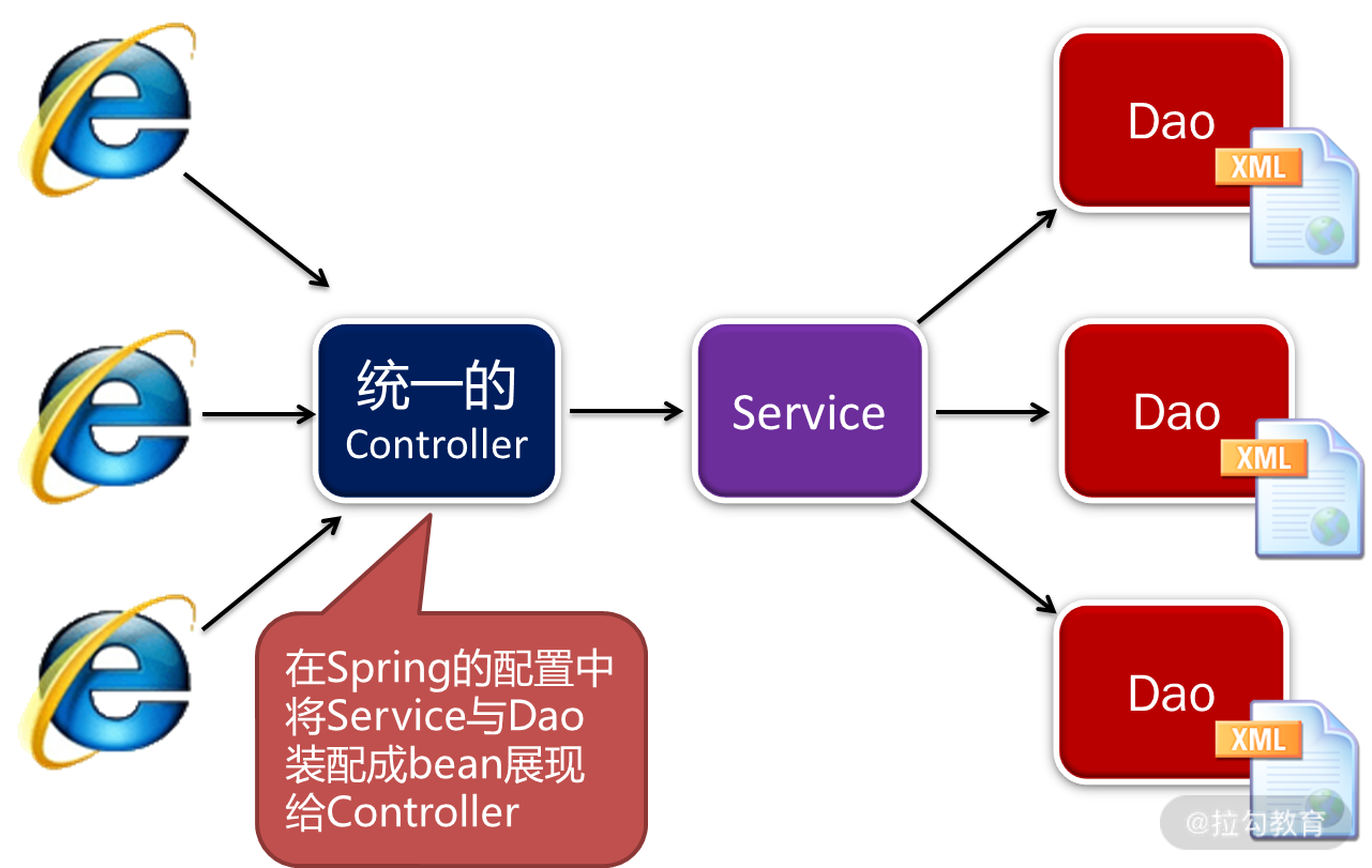 在增删改部分中,采用了前面提到的单 Controller、单 Dao 的架构设计。如上图所示,各功能都有各自的前端 UI。但与以往架构不同的是,每个功能的前端 UI 对后台请求时,不再调用各自的 Controller,而是统一调用一个 Controller。然而,每个功能的前端在调用这一个 Controller 时,传递的参数是不一样的。首先从前端传递的是 bean,这个 bean 是什么呢?后台各功能都有一个 Service,将该 Service 注入 Dao 以后,会在 Spring 框架中配置成一个bean。这时,前端只知道调用的是这个 bean,但不知道它是哪个 Service。