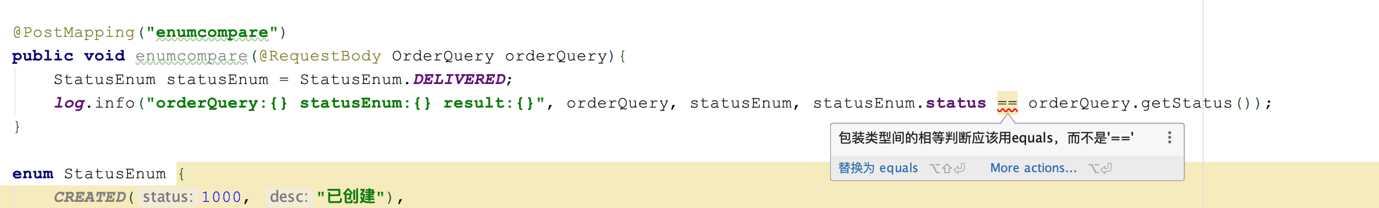 }在业务代码中,开发同学使用了 == 对枚举和入参 OrderQuery 中的 status 属性进行判等: