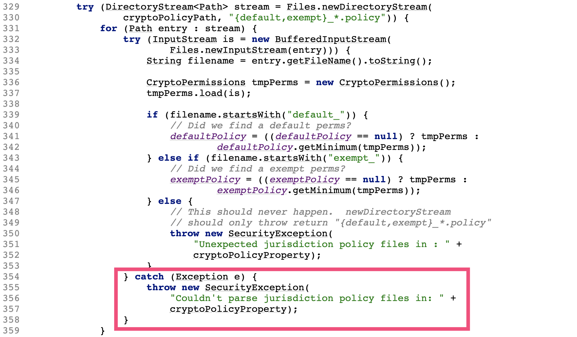 ... 20 more查看 JDK JceSecurity 类 setupJurisdictionPolicies 方法源码,发现异常 e 没有记录,也没有作为新抛出异常的 cause,当时读取文件具体出现什么异常(权限问题又或是 IO 问题)可能永远都无法知道了,对问题定位造成了很大困扰: