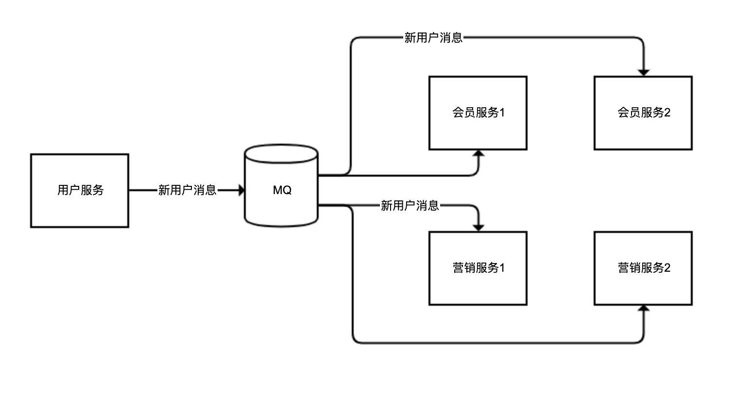 我们来看一个用户注册后异步发送欢迎消息的场景。用户注册落数据库的流程为同步流程,会员服务收到消息后发送欢迎消息的流程为异步流程。