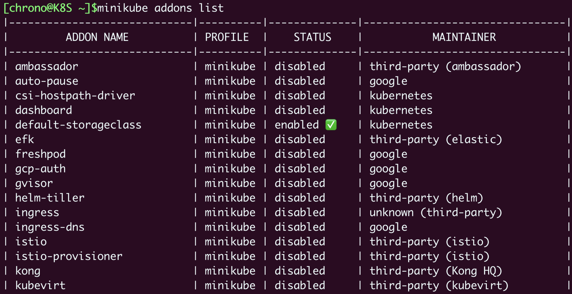 minikube也支持很多的插件,使用命令 minikube addons list 就可以查看插件列表: