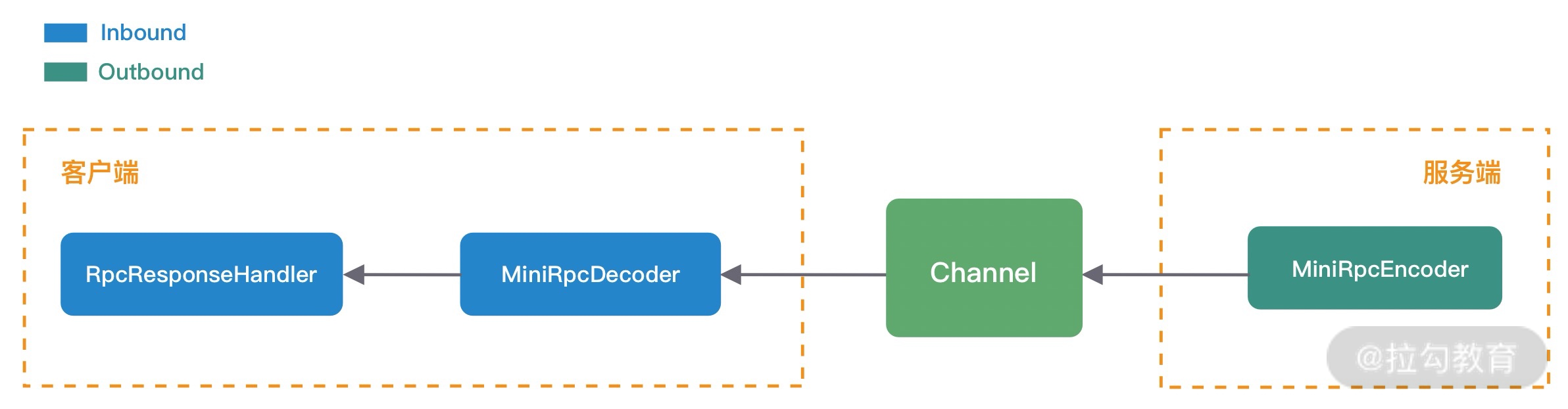 本节课我们通过 RPC 自定义协议的设计与实现,加深了对 Netty 自定义处理器 ChannelHandler 的理解。ChannelPipeline 和 ChannelHandler 是我们在项目开发过程中打交道最多的组件,在设计之初一定要梳理清楚 Inbound 和 Outbound 处理的传递顺序,以及数据模型之间是如何转换的。