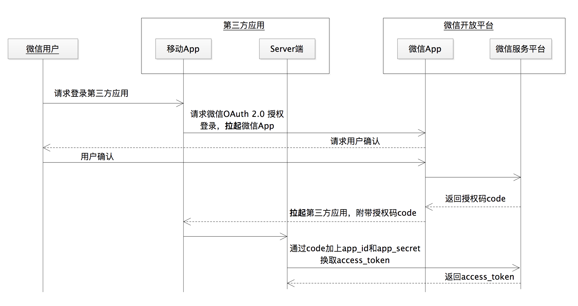 大概流程是:当我们访问第三方 App 的时候,需要用到微信来登录;第三方 App 可以拉起微信的 App,我们会在微信的 App 里面进行登录及授权;微信 Server 端验证成功之后会返回一个授权码 code,通过微信 App 传递给了第三方 App;后面的流程就是我们熟悉的使用授权码 code 和 app_secret,换取访问令牌 access_token 的值了。