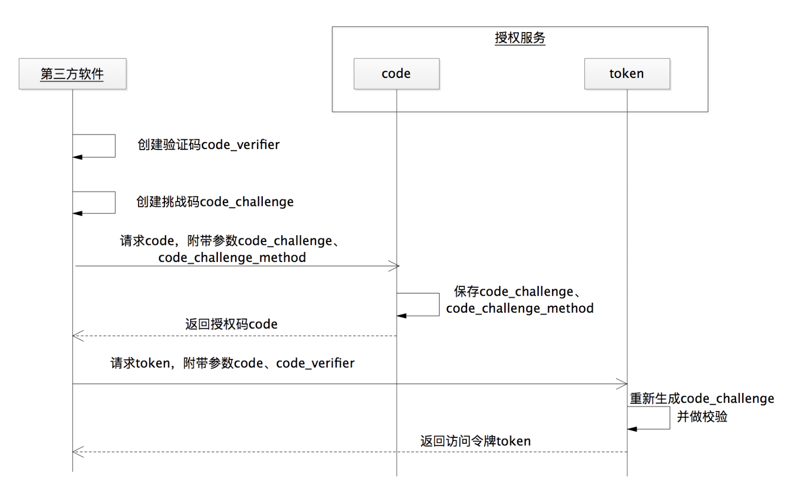 在下面的流程图中,为了突出第三方软件使用 PKCE 协议时与授权服务之间的通信过程,我省略了受保护资源服务和资源拥有者的角色: