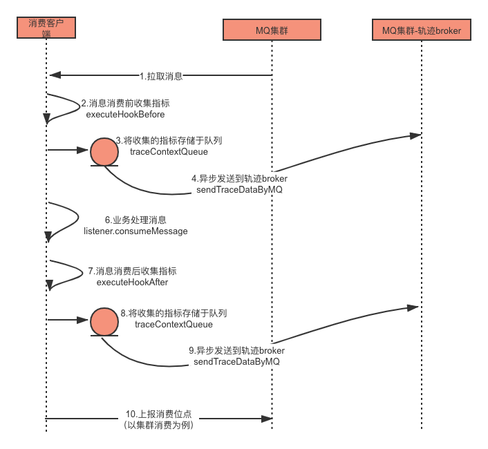 发送轨迹原理:在消息发送前与发送后收集指标信息,并将指标信息异步发送到轨迹主题。