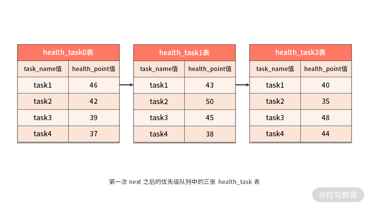 现在,我们已经在每个 health_task 结果集中根据 task_name 进行了排序,所以 health_task0、health_task1、health_task2 中的“task1”都排到了最前面,也就是队列的第一个元素。