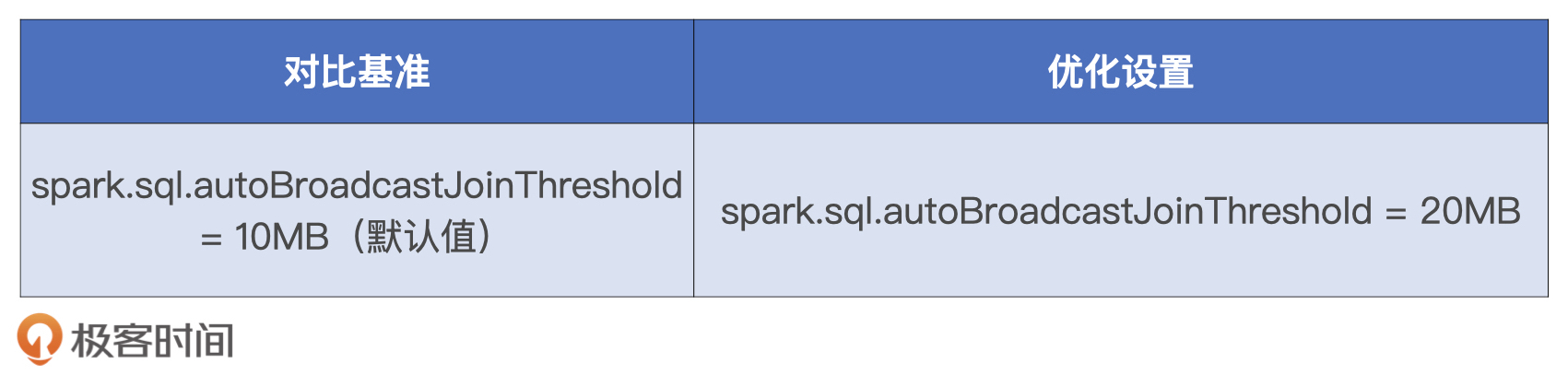 两组对比实验的运行时间,我记录到了下面的表格中。从中我们不难发现,上述两个参数的调整,对于作业端到端执行性能的影响不大。不过,这种参数调了半天,执行效率并没有显著提升的场景,肯定让你似曾相识。这个时候,最好的办法就是我们继续借助“木桶短板”“瓶颈”以及“调优方法论”,去尝试其他的调优思路。