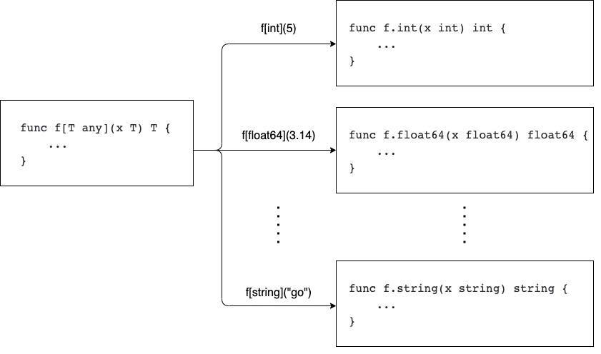 我们看到,Go编译器为每个调用生成一个单独的函数副本(图中函数名称并非真实的,仅为便于说明而做的命名),相同类型实参的函数只生成一次,或通过链接器消除不同包的相同函数实现。